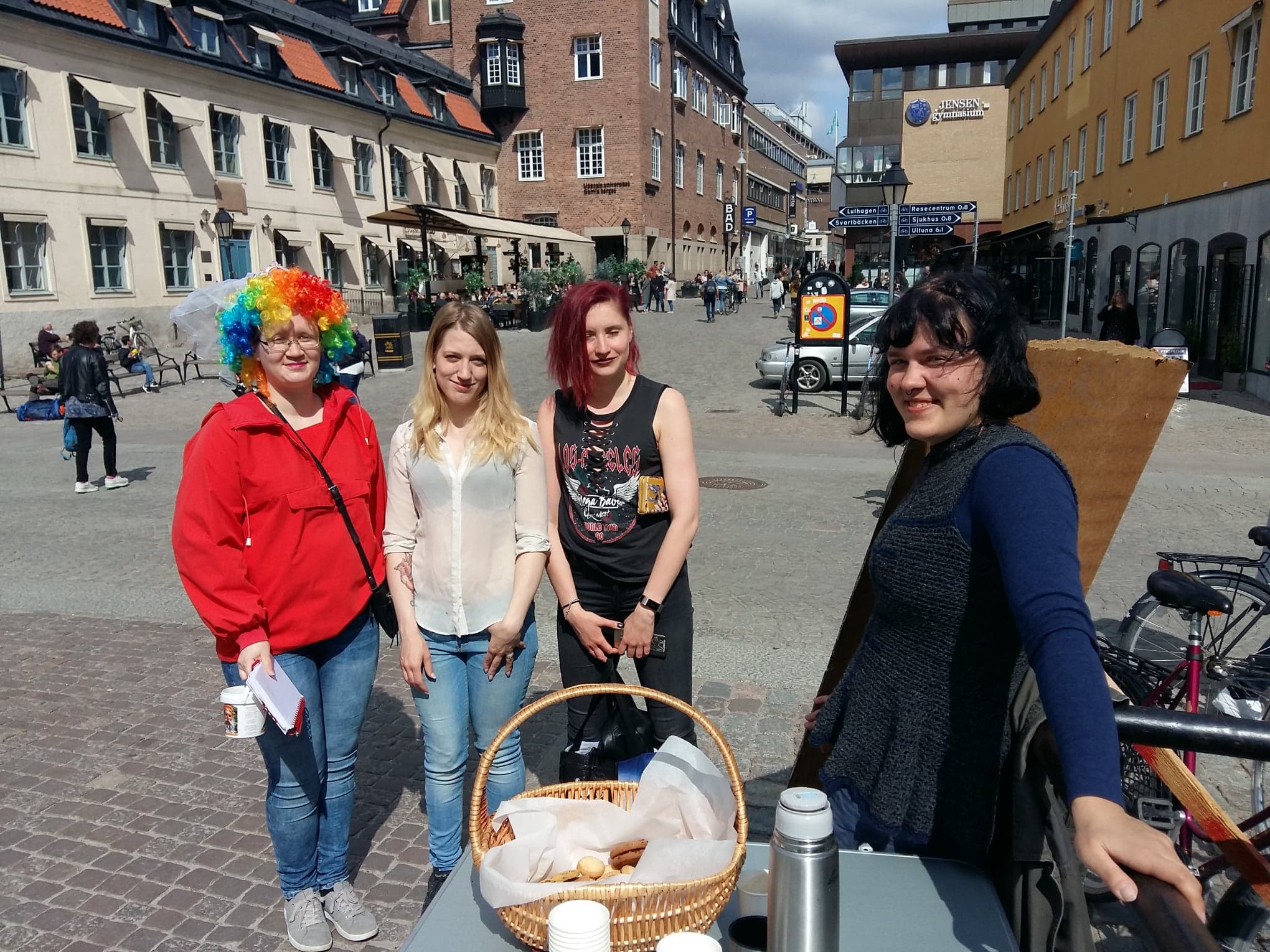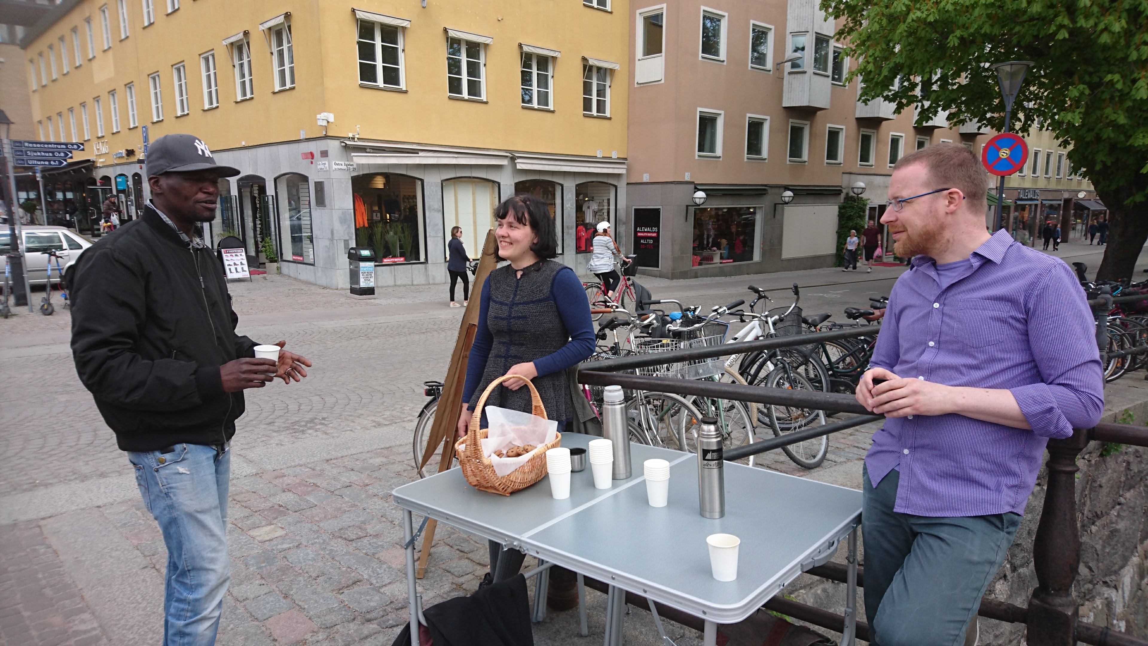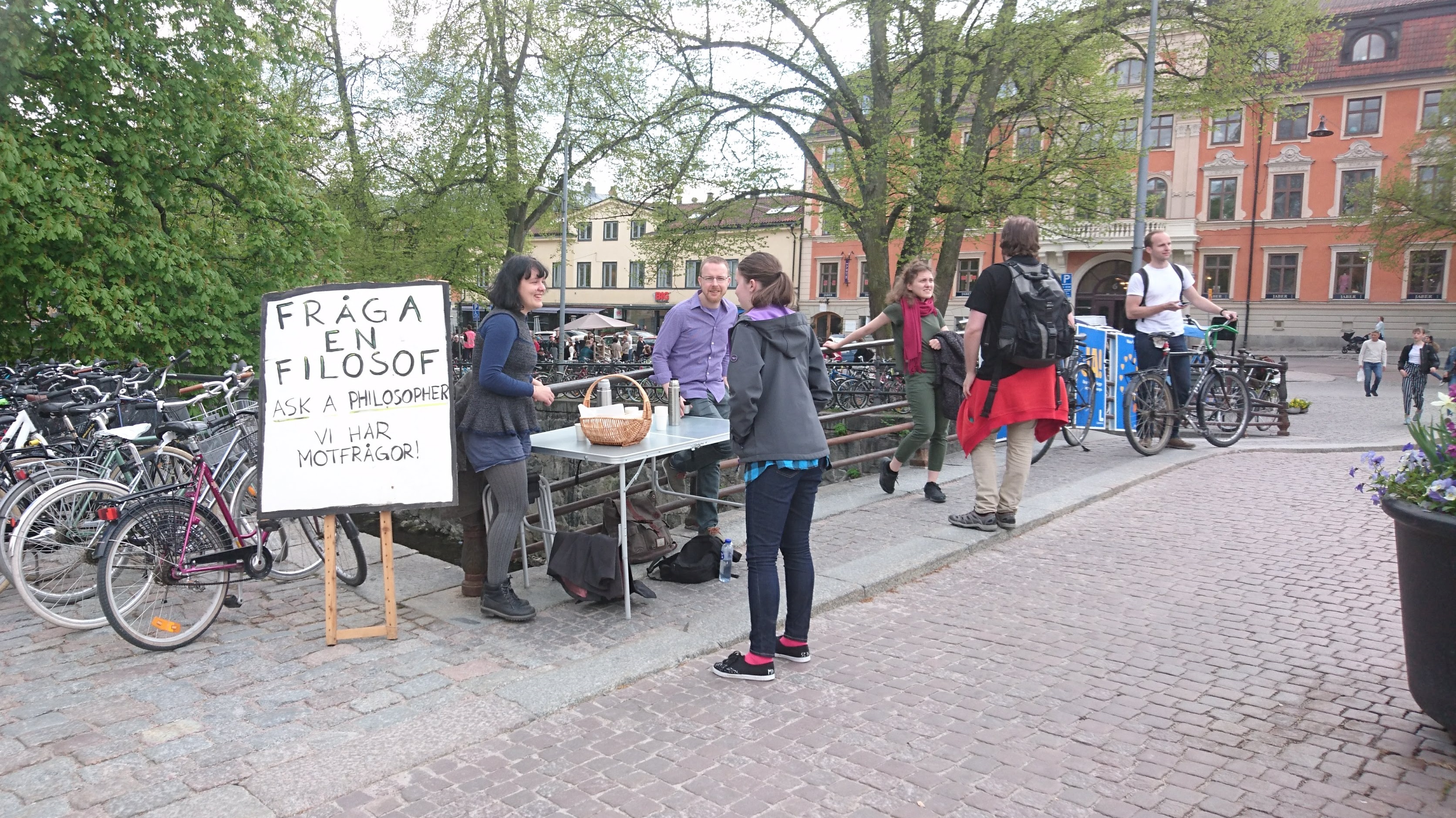 Сегодня Nemi, Sopho Machavariani и я осуществили эту мечту. Мы простояли в центре Уппсалы чуть больше трёх часов (с печеньем и кофе), почти без перерыва общаясь с прохожими. На табличке, помимо «Спроси философа», Неми написала: «У нас есть встречные вопросы!»